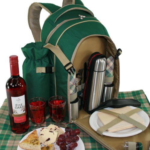 - This Refreshing Picnic Backpack set for 2 is fitted with matching Picnic Rug and is equipped with a Full Dinner Service for Two. The set also benefits from a Stainless steel Vacuum Flask and Double Walled Insulated Mugs. Attached to the left hand side of the set you will find a Detachable Wine Bottle Cooler. Whilst the bags main compartment is a Large Fully Insulated Cool Bag perfect for storing Hot or Cold Food.